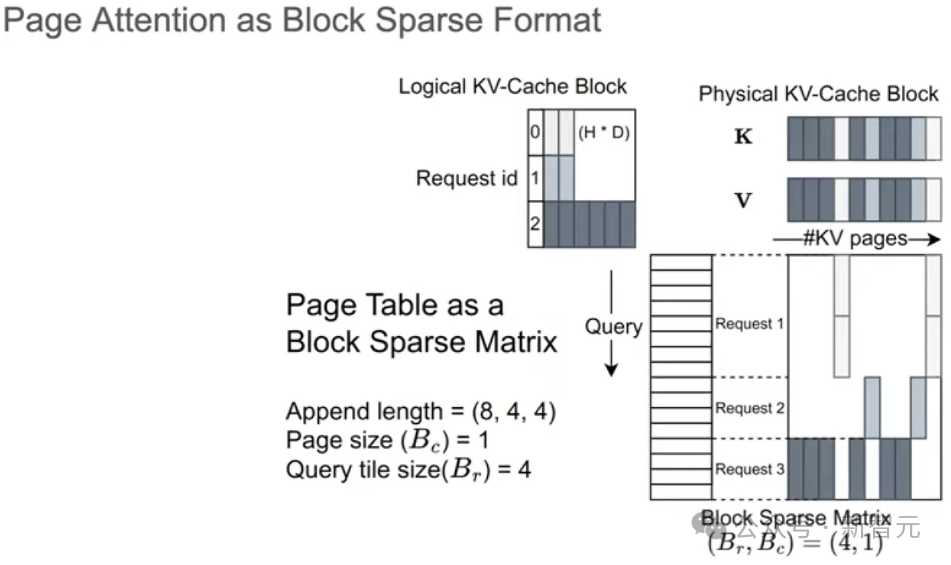 Paged Attention的block可以直接对应到BSR的block,如下图所示,让Bc = 1。而query tile size(Br)设为4保证矩阵乘法的硬件利用率。