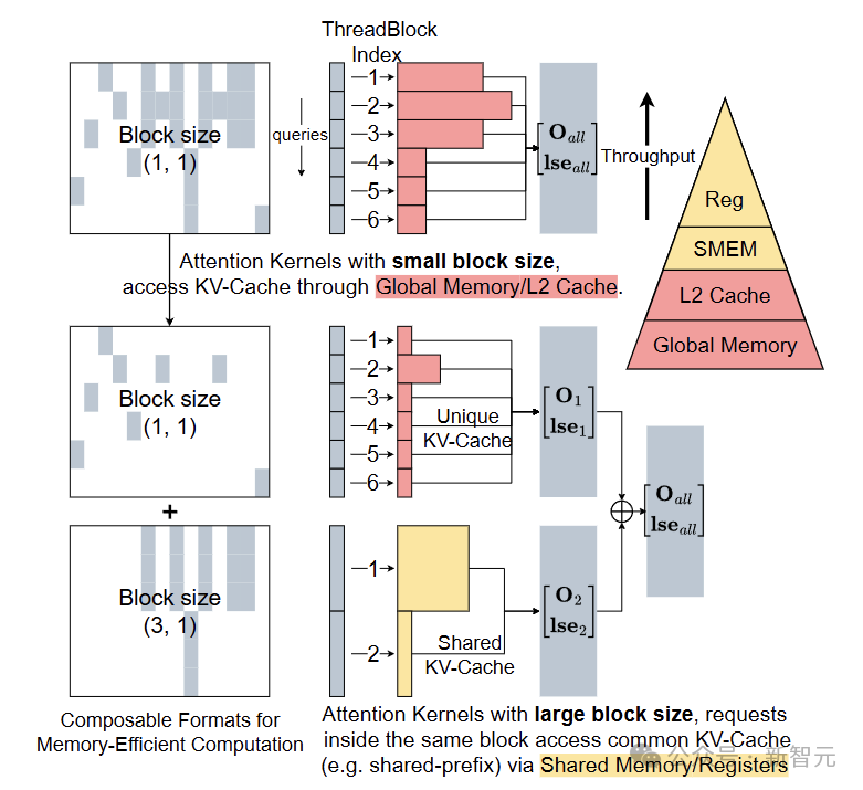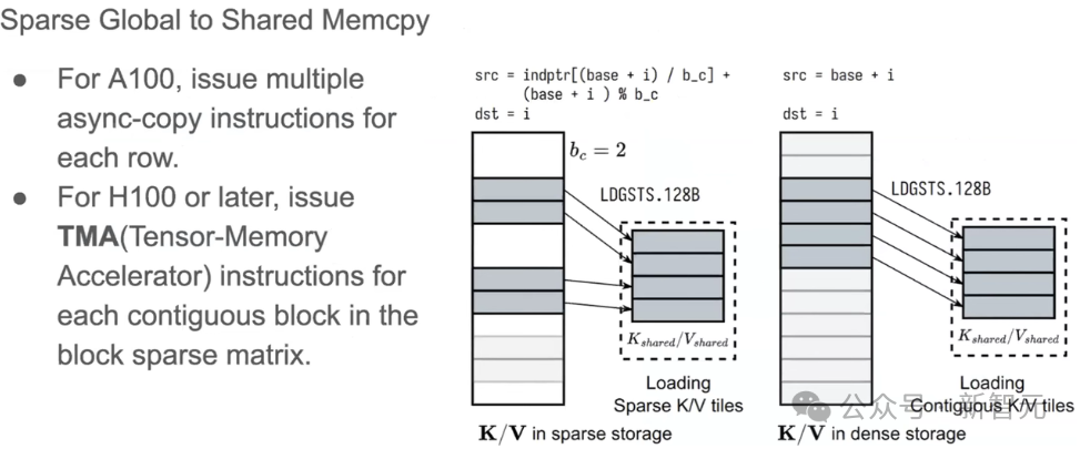 在FlashInfer中,系统从global memory中加载稀疏块数据,并在shared memory中将其排布成密集格式,tensor core可以直接计算这些数据,不会产生硬件的浪费。