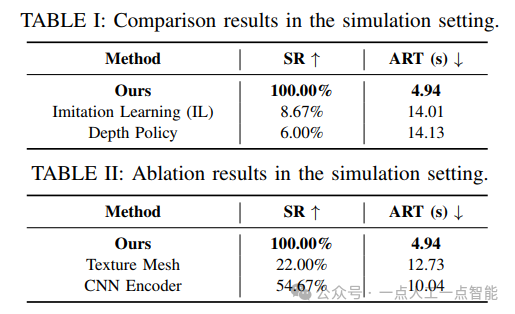 在模拟实验中,作者比较了不同的方法并进行了ablation实验。其中,imitation learning(IL)方法由于缺乏数据样本和策略探索而表现不佳。深度政策无法区分不同颜色的锥形物,因此不能有效地训练,行为类似于随机动作。纹理网格无法生成真实的图像,CNN编码器难以从图像中提取精确的特征。这些结果证实了VR-Robo在多样化实验设置中的有效性和鲁棒性。