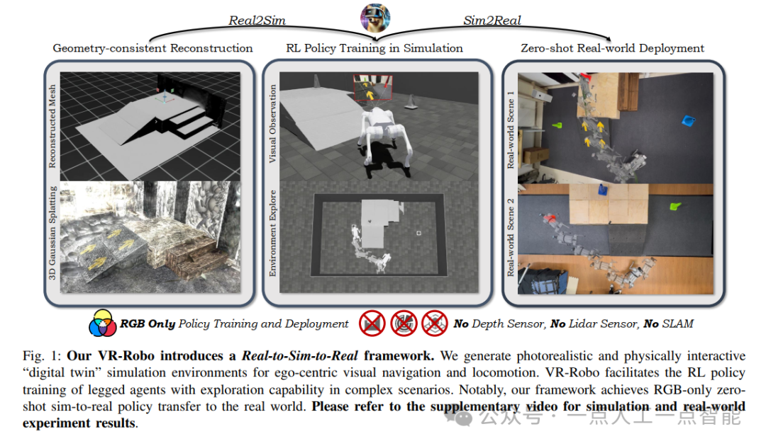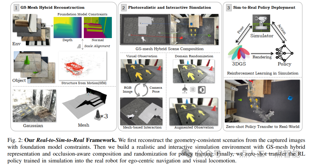 一是重建现实和交互式仿真环境的能力,支持视觉观察和网格互动的运动策略训练;二是部署到现实世界时最小化仿真与现实之间的差距。