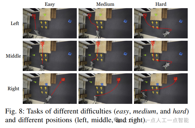 在实验中,作者使用iPads或iPhone拍摄照片来重构室内场景,并在Isaac Sim上进行低级和高级策略的训练。然后将策略部署到Uni-tree Go2四足机器人上,并使用ROS2进行通信。最后,在模拟和现实环境中进行了各种基准实验和探索实验,以验证VR-Robo的效果。