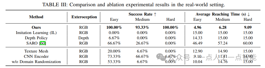 在现实世界实验中,作者还比较了两种特定于现实世界的基准方法:SARO和w/o domain randomization。