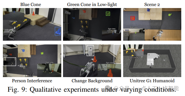在VR-Robo方面,作者实现了最高的成功率和最短的平均到达时间,证明了其效率和鲁棒性。此外,作者还进行了各种条件下的定性实验,包括不同颜色的目标锥体、光照条件的变化、不同的场景、随机干扰、背景变化以及在Unitree G1人形机器人上进行训练。这些实验展示了VR-Robo的适应性,可以在广泛的环境和条件下工作。