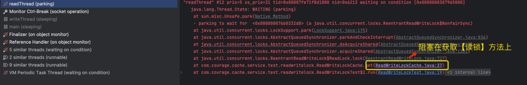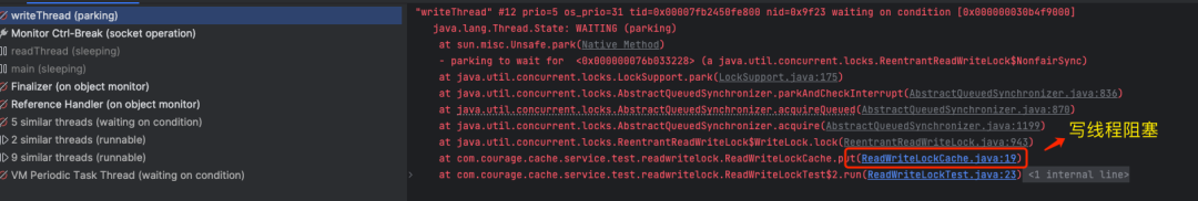 我们通过 IDEA 打印堆栈日志,发现:写线程先获取写锁,然后休眠 10 秒,这样写锁就不会释放,后面读线程尝试获取读锁时,线程阻塞了。