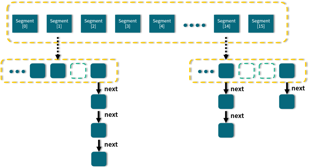 从图中我们可以看出, ConcurrentHashMap 内部进行了 Segment 分段,Segment 继承了 ReentrantLock,可以理解为一把锁,各个 Segment 之间都是相互独立上锁的,互不影响。