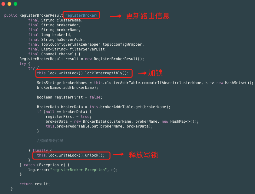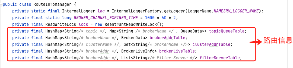 路由信息通过几个 HashMap 来保存,当 Broker 向 Nameserver 发送心跳包(路由信息),Nameserver 需要对 HashMap 进行数据更新,但我们都知道 HashMap 并不是线程安全的,高并发场景下,容易出现 CPU 100% 问题,所以更新 HashMap 时需要加锁,RocketMQ 使用了 JDK 的读写锁 ReentrantReadWriteLock 。