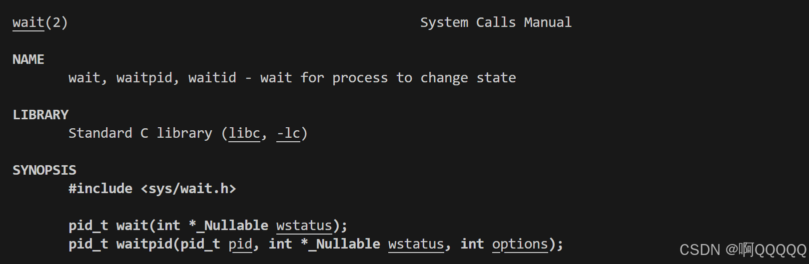 (1) WIFEXITED(status) : 若为正常终止子进程返回的状态,则为真。(查看进程是否是正常退出) 其实等价于status&0x7F (2) WEXITSTATUS(status): 若WIFEXITED非零,提取子进程退出码。(查看进程的退出码)其实等价于(status<<8)&0xFF (3)NULL:不关心子进程的状态;