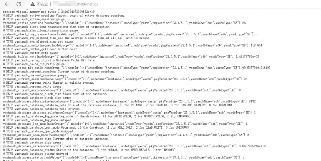 2. 然后编辑数据库实例配置文件,设置好数据库地址等信息。接着在 9100 端口启动 YashanDB Exporter,此时访问 Metrics 接口已经可以看到采集到的数据库信息: