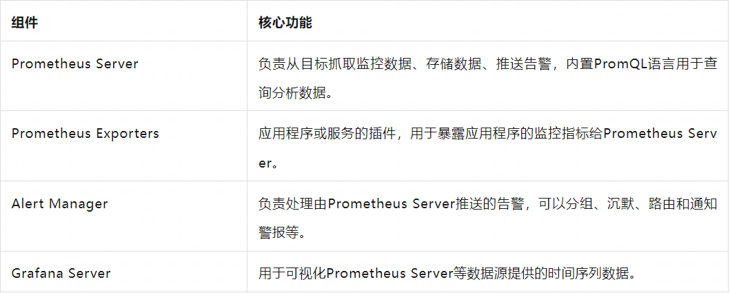 在数据库运维工作中,数据库监控是至关重要的一环。常见的数据库监控方案有:Prometheus+Grafana、Zabbix、Nagios 等。其中,Prometheus+Grafana 是目前业界较为流行的监控解决方案之一,广泛应用于:实时资源监控、监控结果可视化、资源异常告警、监控数据分析等场景。该方案中包含几个关键组件,其核心功能的简要说明如下: