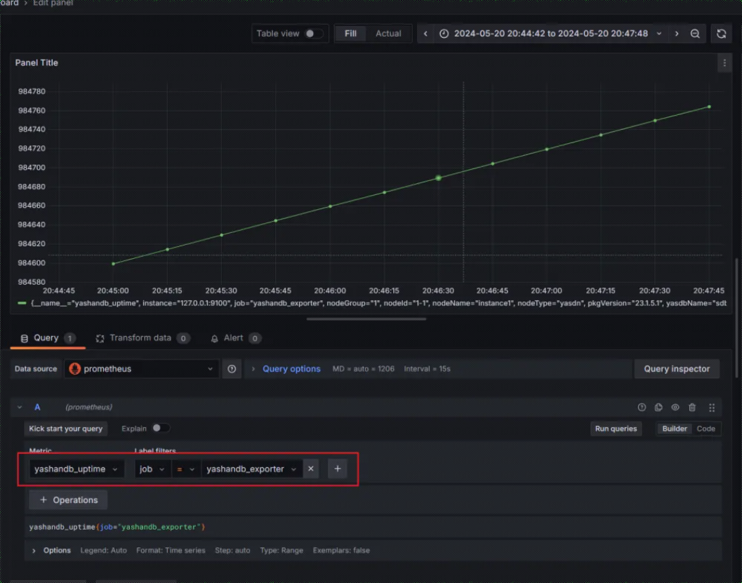 8. 添加 Dashboard,以监控数据库实例的启动时间(yashandb_uptime)为例: