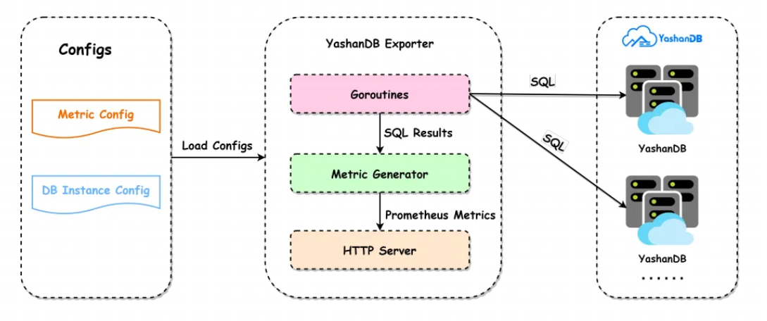 此外,为了灵活控制 YashanDB Exporter 的行为,我们需要两个配置文件:指标配置文件(Metric Config)和崖山数据库实例配置文件(DB Instance Config)。