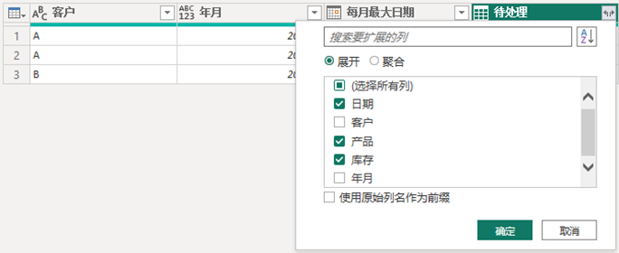 STEP 3 点击待处理列标题右侧的展开按钮,选择日期、产品、库存,去掉使用原始列名作为前缀的挑勾以保持列名的简洁性。