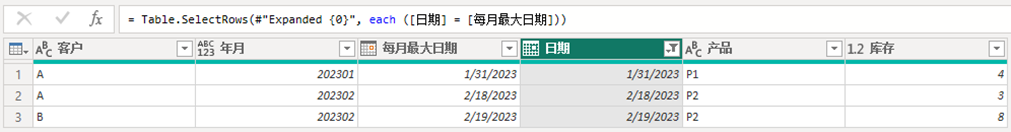 STEP 4 对日期列筛选任何一个值,然后把等号后面的部分改为[每月最大日期],这样就留下了第二步中客户、年月对应的最大日期的数据。