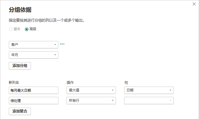 STEP 2 按住Ctrl键选择客户列和年月列,点击菜单栏转换下的分组依据,按照客户、年月分组,一列命名为每月最大日期,操作对日期取最大值,一列命名为待处理,操作取所有行。