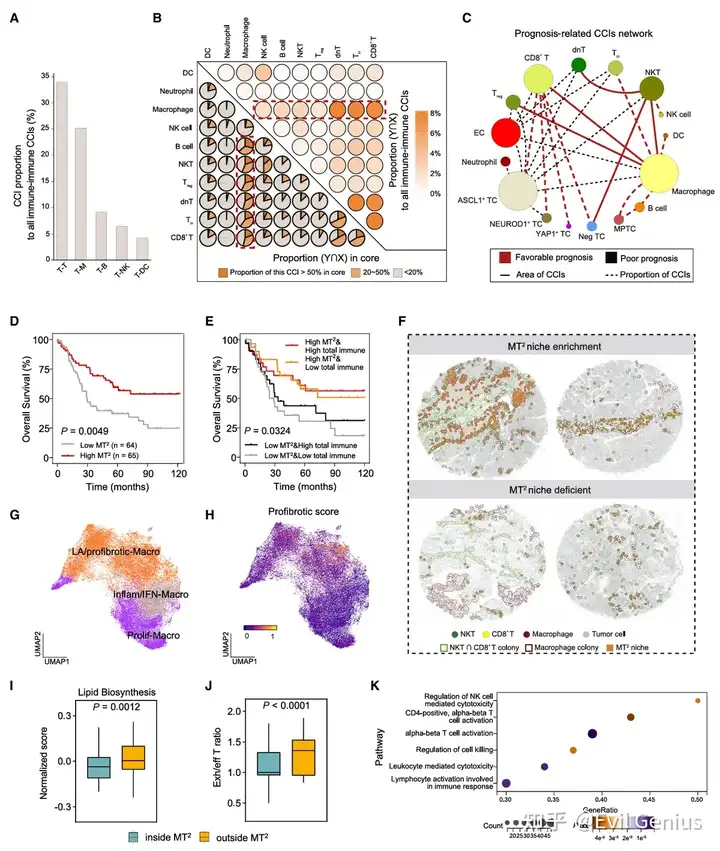使用ColonyMap系统地进行了CCI分析。发现了一个有趣的免疫活性MT2生态位,由抗原呈递巨噬细胞与活化的细胞毒性T细胞和NKT细胞组成,与小细胞肺癌的总体“免疫沙漠”无关,都与良好的存活率有关。这些免疫细胞的不同功能状态表明小细胞肺癌内存在独特的局部瘤内微环境,暗示MT2生态位可能会影响免疫治疗反应。
