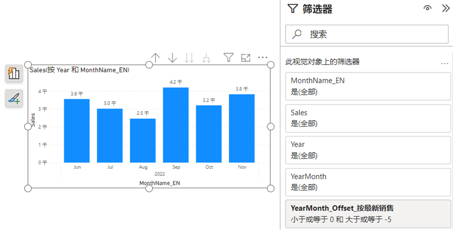 把YearMonth_Offset_按最新销售字段放入视觉对象筛选器,使用高级筛选,选择大于等于-5且小于等于0,报告就会动态显示基于最新销售日期的近6个月的数据了。
