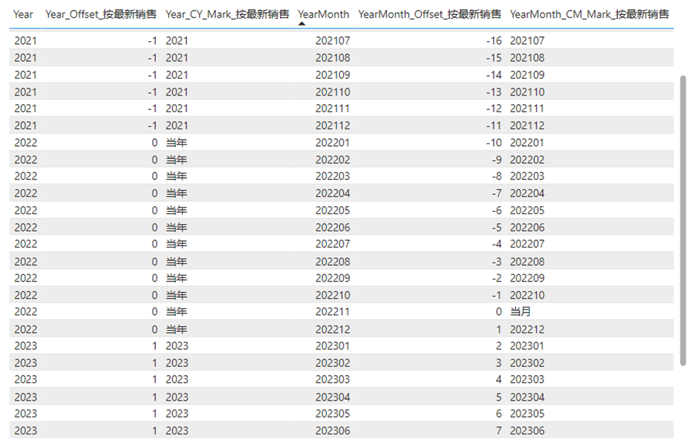 本质上还是在日期表中新增定位列,只是这次和日期表的年/月/日对比的不是当前的年/月/日了,而是交易数据中的最大日期,把对应最大交易日期的年/月标记为当前年和当前月,并定位为0以及基于此生成年和年月的定位序号。