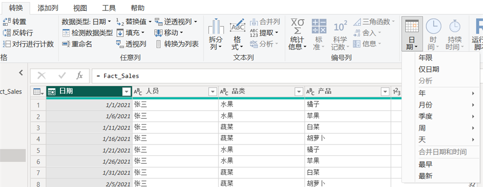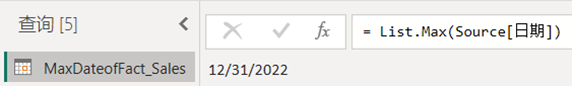 STEP 2 在新的销售表中,选中日期列,点击菜单栏转换下的日期,选择最新,并命名为MaxDateofFact_Sales,生成了一个随事实表变化的动态最新日期参数。