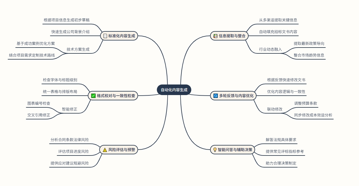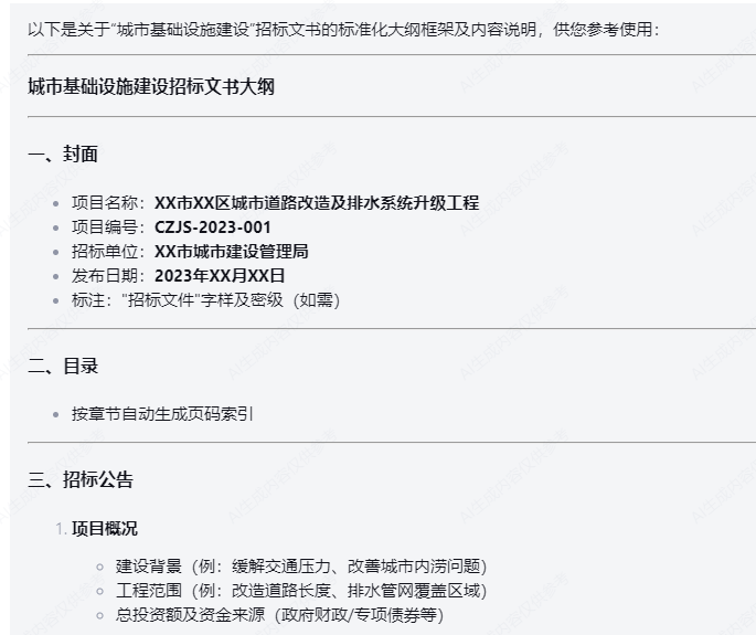 自动化内容生成:许多招标文书包含大量标准化的内容,如项目介绍、公司资质、投标要求等。AI 可以根据项目基本信息,自动生成这些标准化部分的初步草稿。比如,当招标文书需要介绍某公司背景时,AI 可以根据提供的公司信息,快速生成符合格式的公司介绍段落,极大地节省了人工编写时间。此外,对于招标项目的技术方案描述,AI 能依据过往类似项目的成功案例和当前项目的特殊需求,生成针对性的技术路线阐述,让技术方案的起草更高效。