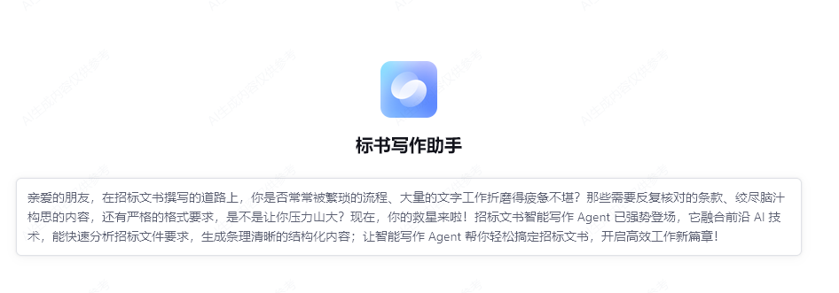 1亲爱的朋友,在招标文书撰写的道路上,你是否常常被繁琐的流程、大量的文字工作折磨得疲惫不堪?那些需要反复核对的条款、绞尽脑汁构思的内容,还有严格的格式要求,是不是让你压力山大?现在,你的救星来啦!招标文书智能写作 Agent 已强势登场,它融合前沿 AI 技术,能快速分析招标文件要求,生成条理清晰的结构化内容;让智能写作 Agent 帮你轻松搞定招标文书,开启高效工作新篇章!