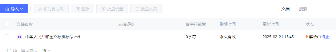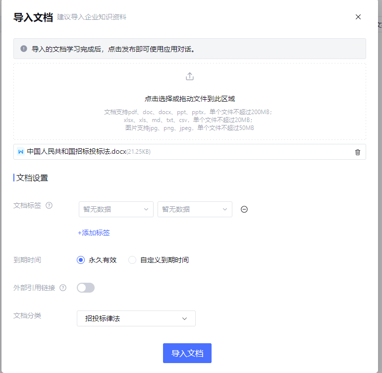 其中网页导入可以需要输入备案和企业主体一致的网址,比如我们想要获取中华人民共和国招标投标法,只需要获取到有关该律法的网站URL,输入即可获取文档: