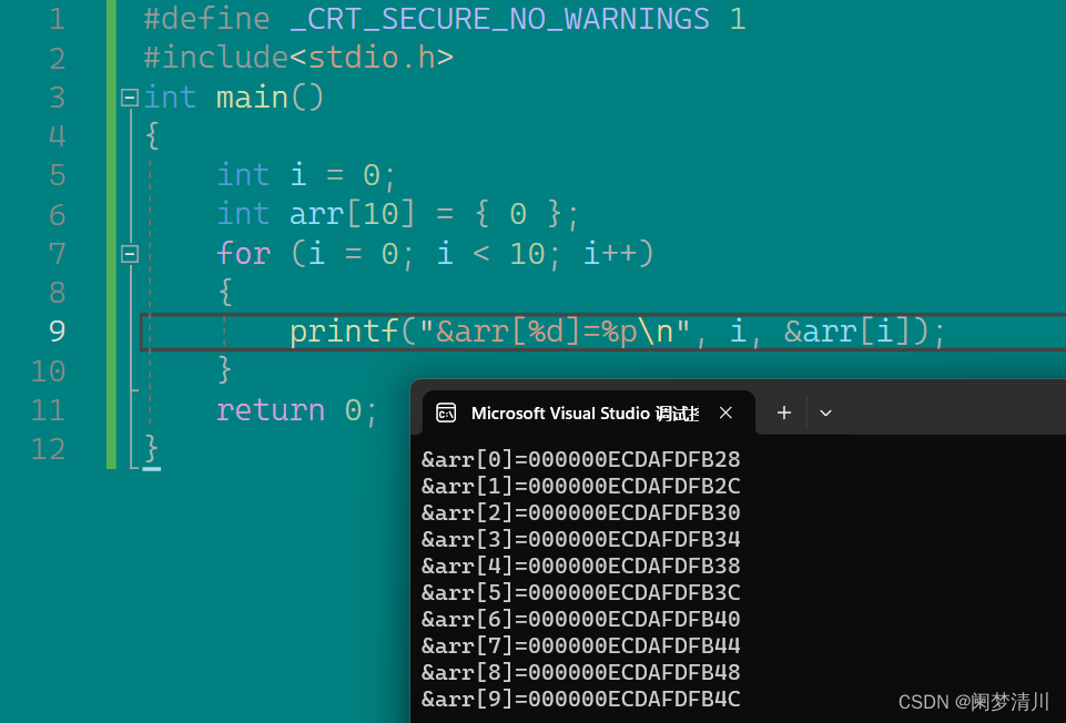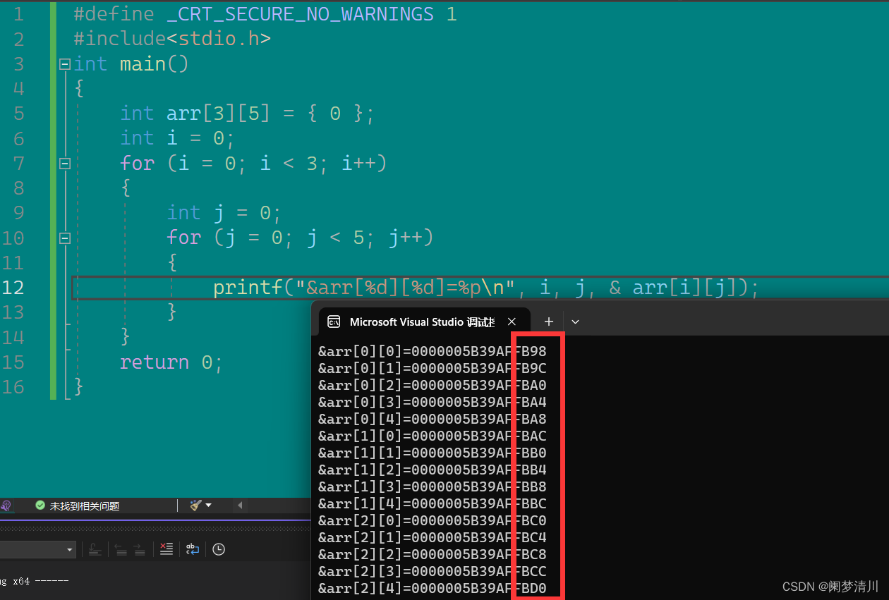 %p是打印地址的,通过打印数组中每个元素的地址(以16进制的形式进行打印,而且开头的0不会省略)(%#x可以让打印的结果前面加上0x,x无论大写,小写都可以),我们可以看出数组中的元素是如何排列的;显然,他们之间相差4个字节,那么我们也可以得出,一维数组在内存中是连续存在的