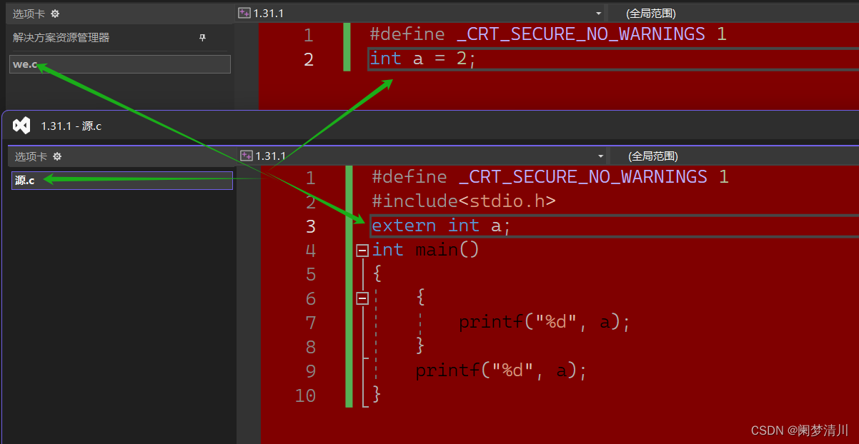 在不同的文件中,如果想要使用的某个变量没有在本文件定义,需要使用extern关键字声明;