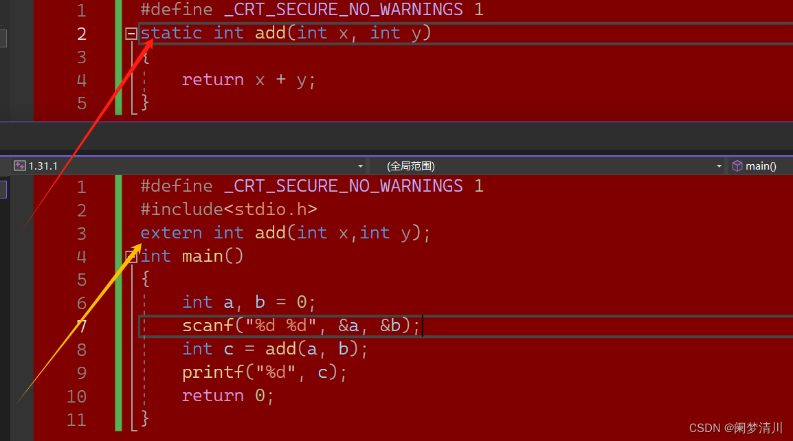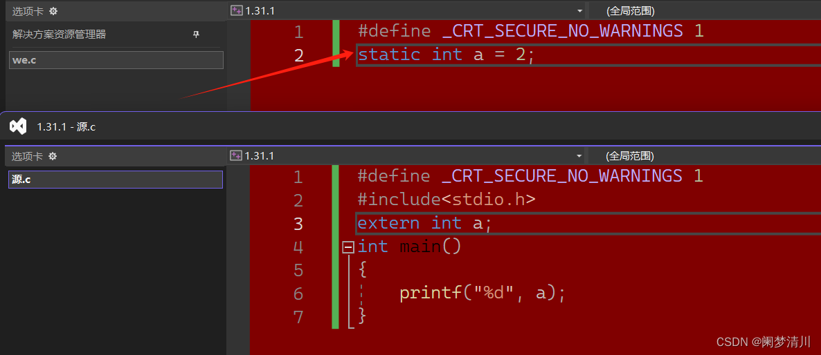 尽管使用extern进行声明,但是如果加上static之后就无法使用,因为加上以后全局变量的外部链接属性就变成了内部链接属性,只能在自己的文件使用,变得相对安全;