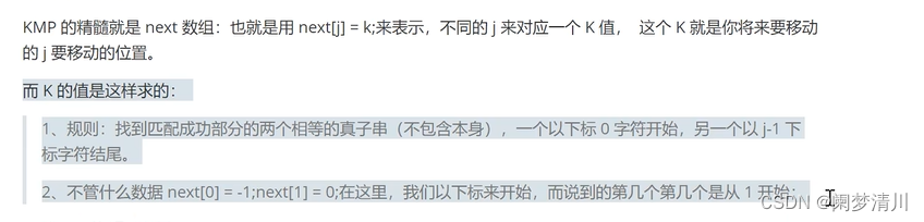 对于初学者我们必须要清楚的是,这个算法是如何用的,通俗的讲,对于一个子串,我们应该看他是否和主串的字符相同,如果相同就进行下一个,如果不相同,我们的子串j就要回退到一个特定的位置,这个位置的求法就是我们要知道的,接下来我们讨论的和练习的都是这个回退下标的计算
