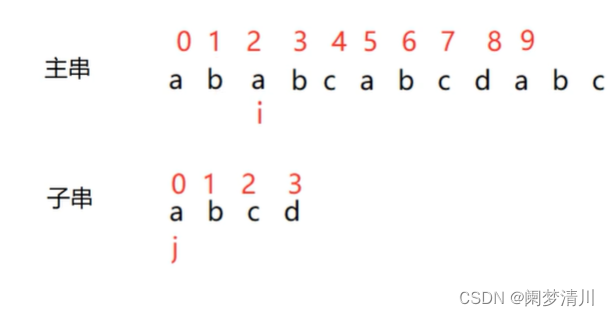 (6)接下来我们需要计算这个下标的变化,以代码主函数里面的第一个作为案例,i指向的是主串的第一个字符,j指向的是字串的第一个字符,第一个都是a,i++,j++,第二个都是b,i++,j++,第三个都是c,i++,j++,第四个就不一样了,这个时候我们需要重新寻找,i和j都要回退,j肯定是回退到0下标,i应该从第二个字符开始,因为我们刚刚是从第一个开始找,找不到,那么这个2下标应该如何表示呢?我们首先要清楚的是i和j的移动的个数是一致的,j已经走了j个,那么i-j就可以表示i开始的位置,但是这个位置找不到,我们就要从他的下一个位置开始找,我们就可以用i-j+1进行表示主串里面下标回退的位置;我们设置一个循环,依次进行,直到主串遍历完成或者子串遍历完成就停止退出循环;