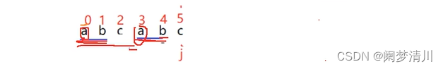 我们的规定是第一个元素回退到-1下标,第二个回退到0下标(这个记住即可,后面会有用处,可以简单的理解为这个就是规定),从第三个开始,我们就可以根据规则手动求解,第三个c回退到哪个下标,是以a开始,以他前面的b结尾的两个相同的子串,因为只有一个ab,所以我们next[2]=0;第四个字符,我们要找到以a开始,以c结尾的两个字符串,因为这里只有abc,所以next[3]=0;下一个b字符,我们要找到以a开始,以a结尾的两个字符串,他们的长度是1,所以next[4]=1,同理next[5]=2,这样我们就手动求解了这个next数组;