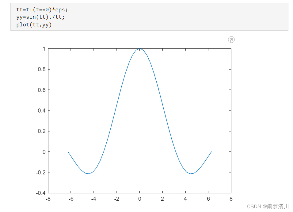 我们只需要在原来的基础上面稍加改动,就可以得到我们想要的函数图像,我们的做法就是使用tt=t+(t==0)*eps,就是在原来的t的基础上面,选取特殊点0乘上eps,就可以让这个点在附近的点取值,换言之就是在0附近找一个点代替0,eps就是一个非常小的数,利用它就可以找到十分接近0的一个点代替0,这样就不会出现截断的现象了;