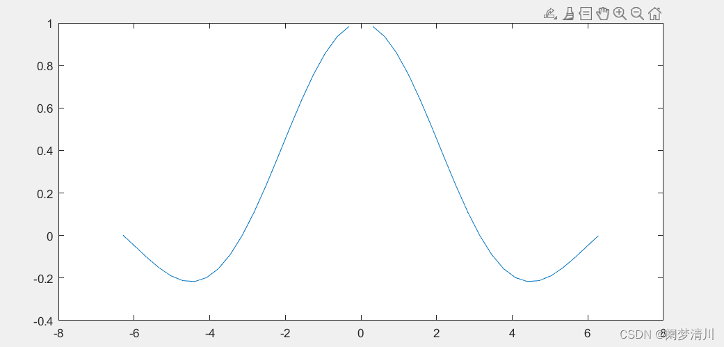 定义域-2*pi到2*pi,绘制的是sin(x)/x的函数图像,这个时候中间就会有0/0的情况,这种情况下就会出现非数的情况,体现在图像上就是截断函数图像