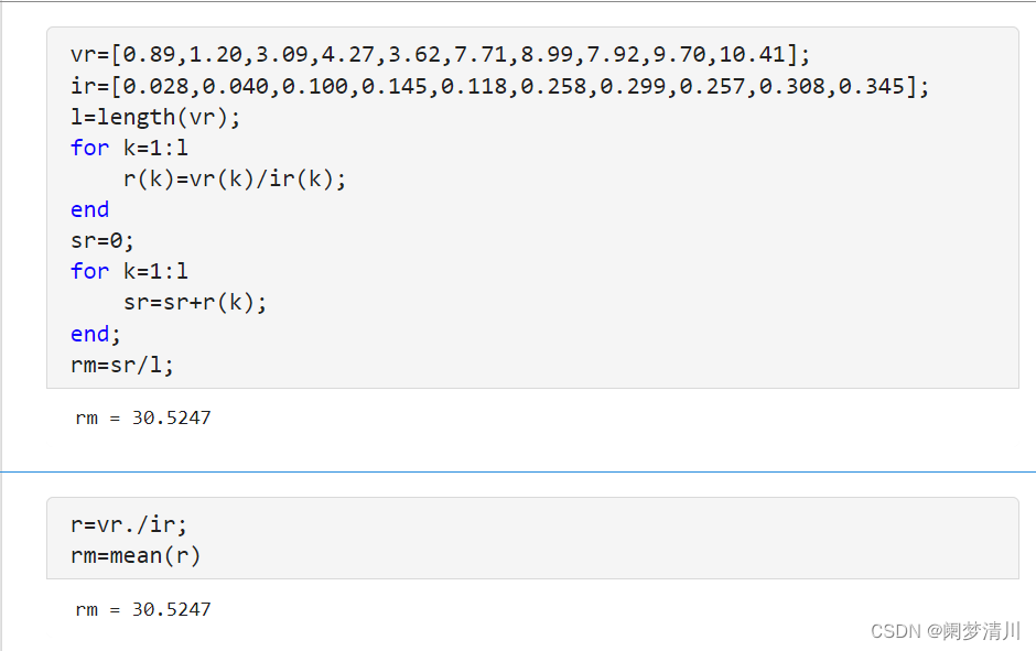 (1)上面的是非向量化编程,使用2个循环,第一个循环计算的是每一组数据对应的电阻,第二个循环计算的是电阻的累加值,最后使用电阻的累加值除以数组的长度(也就是数据的个数)得到的是电阻的平均值;