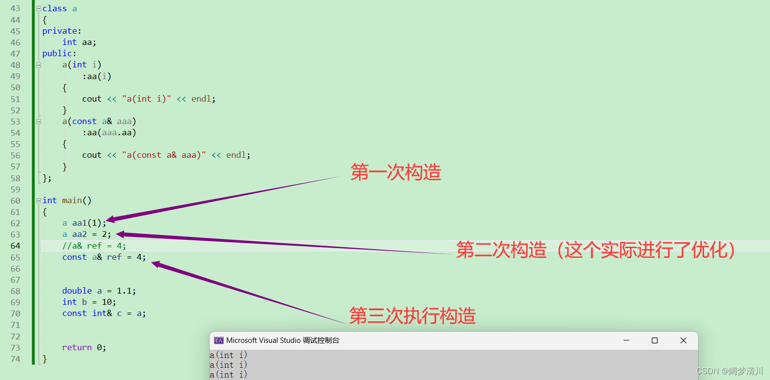 这里的a aa2=2是如何进行优化的呢?底层上来讲,2首先会有一个临时变量进行接收,这个临时变量在执行拷贝构造函数,是拷贝构造函数把2这个是传递给了我们的成员变量;