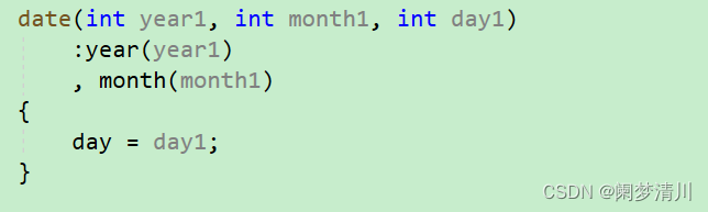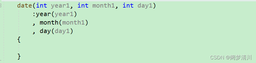 我们的初始化列表就是在形参括号的后面加上冒号,接下来就是三个相同的结构,这三个结构是用逗号分隔开的,这个结构的组成就是成员变量+括号(形参);