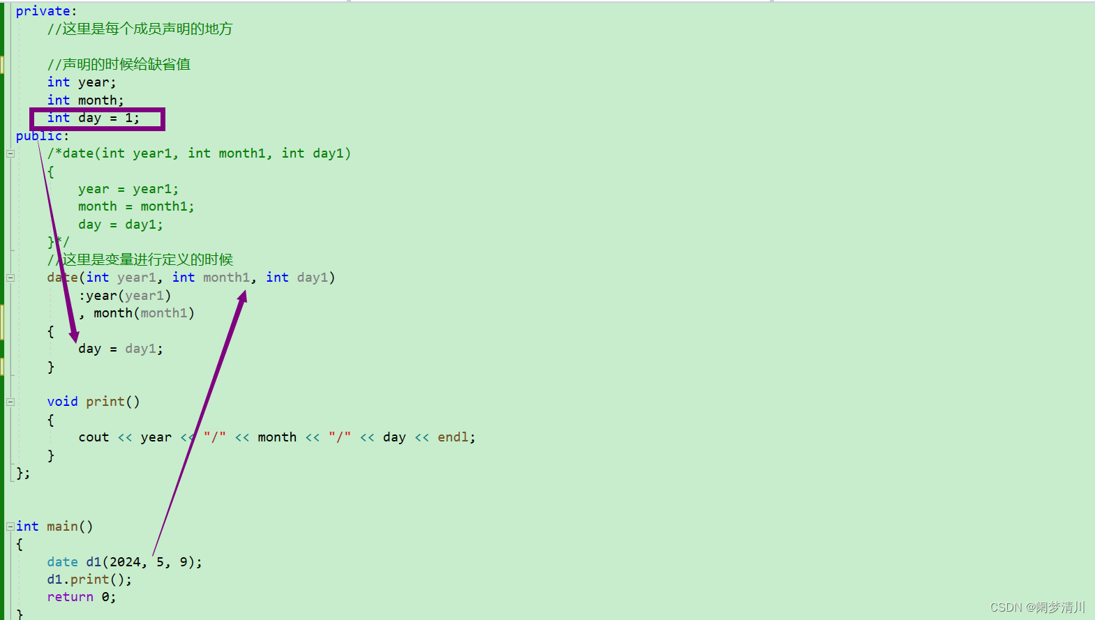 我这里验证的时候只给了day这个成员变量缺省值1,但是在主函数里面进行对象的创建时,肯定会调用默认的构造函数,并且把2024,5,9这三个参数传给对应的值;