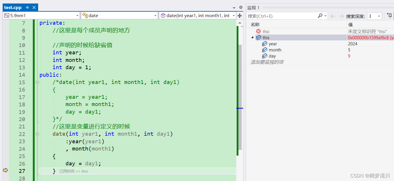 上面显示的是变化之后的结果:就是调试的箭头指向26行的时候,监视窗口里面的day是1,当我们的调试箭头指向27行之后,监视窗口里面的day的值就变成了现在的9,可见这个缺省参数的值是传递给了初始化列表的,之后不过这个缺省参数被我们后来的参数给覆盖掉了;