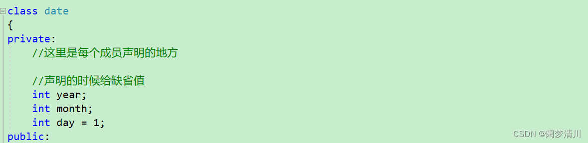 (5)再结合一下我们前面提及到的缺省参数,我们的缺省参数是在声明的时候给出来的 (通俗而言就是在写private里面的变量的时候给缺省参数):
