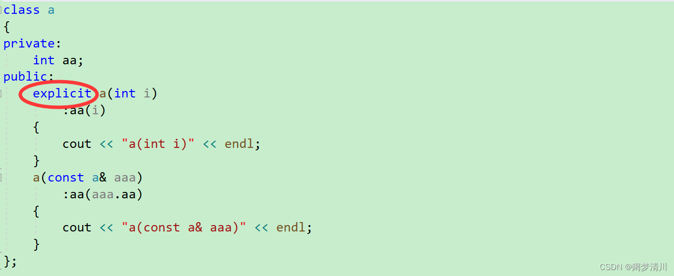(4)对于这个隐式类型转换,我们是可以避免的,就是我们可以使用一些手段不允许编译器进行上面的隐式类型转换,就是在构造函数前面加上explicit关键字,就可以让编译器无法进行隐式类型转换,加上这个关键字的后果就是我们的不同类型数据之间的赋值就会报错(实际上我们一般不会这样做)。