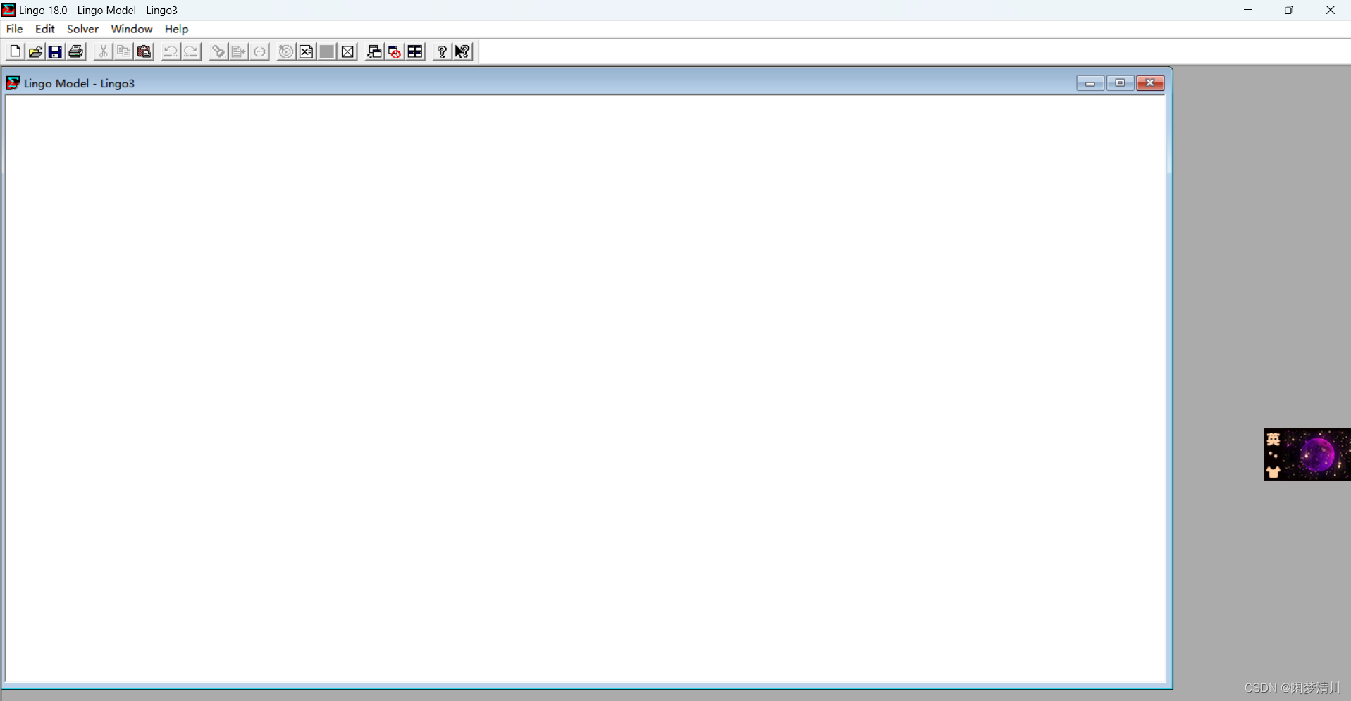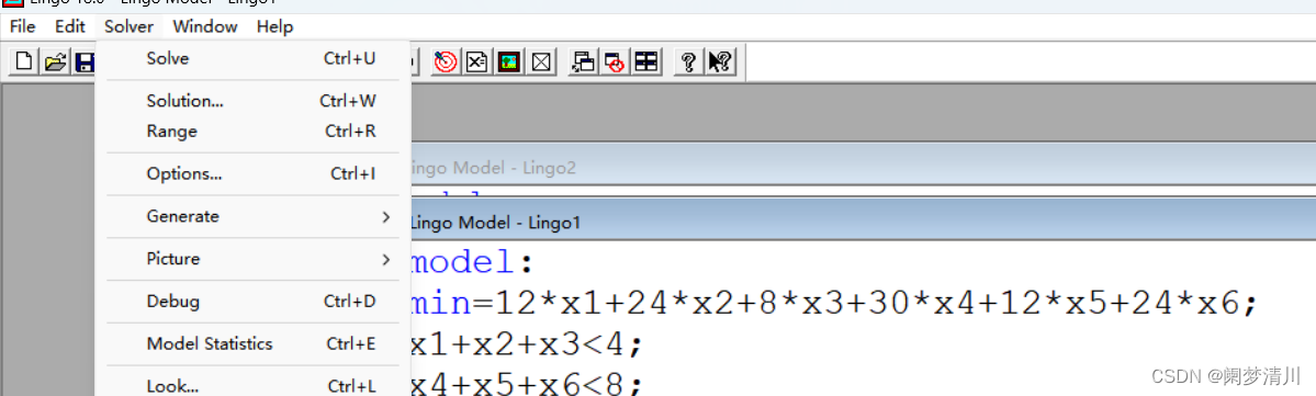 (5)这个软件我之前就是听说过的,但是这个真正的看到还是挺震惊的,上面的这个图片就是这个软件的操作页面,我们对于这个优化问题的求解基本上就是在这个软件上面去进行的(这个上面的工具栏里面的我现在还不是很理解),但是我知道的就是这个第一行向白纸一眼的就是创建一个新的窗口,这个页面是允许多个窗口同时存在的,但是一次只能运行一个窗口,然后点击上面的solve里面的这个solve就可以让这个程序运行了;