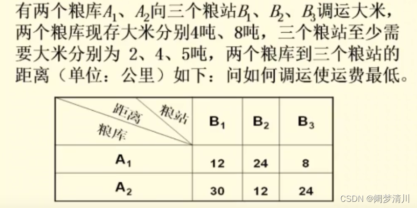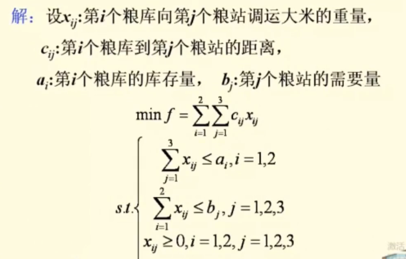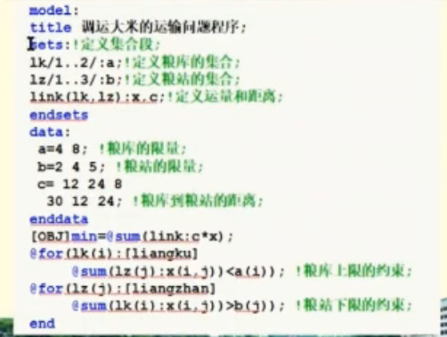 这个就是针对于上面的运粮食的问题,建立的模型,这个也非常容易理解,这个约束条件里面的就是这个运输的粮食不可以超过这个粮库的总量,而且这个每一个商店至少需要的粮食也是有这个最低要求的,我们这些作为这个约束条件,在这个数学里面使用这个s.t表示的就是约束条件,我们在这个高等数学的学习过程里面,也是遇到过这些问题的,我们学习的就是有条件的极值问题,用的就是这个拉格朗日乘数法进行这个求解的,但是那个是针对与只有一个或者少量的自变量而言的,我们要进行这个偏导数的求解,这个显然是不满足的,使用lingo,输入这个求解最小值的目标函数和这个五个约束条件就可以得到这个每个粮库向每一个商店运输的粮食的多少了;