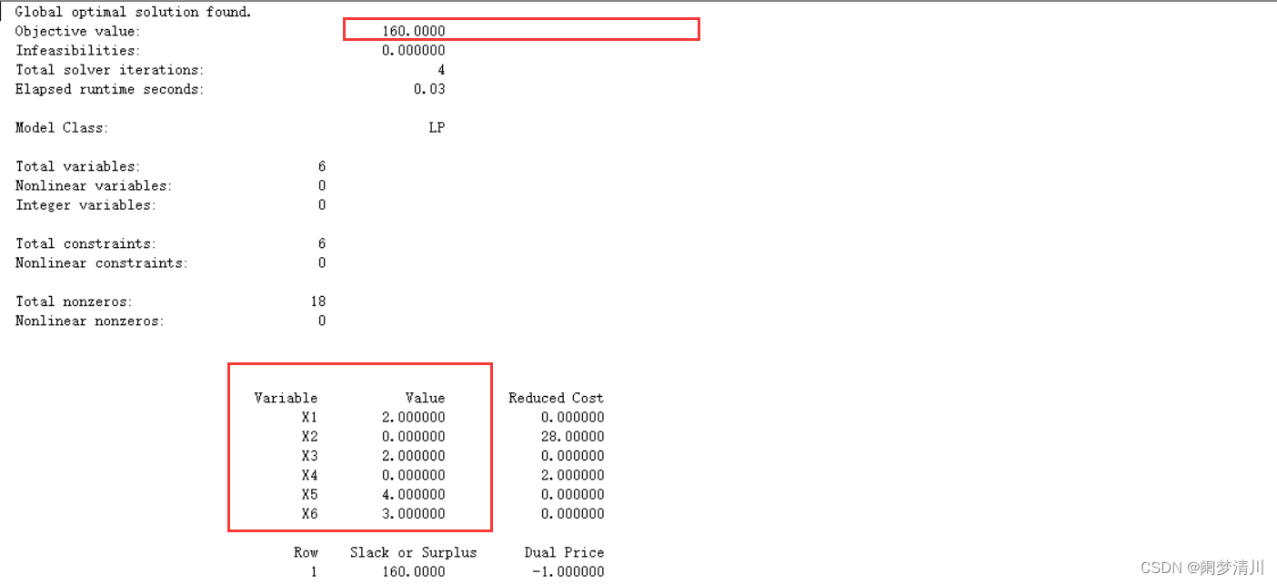 (1)实际上上面的这个lingo使用的方法叫做傻瓜编程 ,因为这个上面的语言都是我们熟悉的,而且我们是一共定义了6个变量,其实在汪教授组开始讲解这个方法的时候,我感觉这个lingo还是很容易的,就输入这个几行代码就求解出来了,而且好像这个lingo的语言和这个数学语言的契合度是比较高的,因为这个lingo里面的这个代码就是我们的数学表达式,只不过在lingo里面没有这个大于等于,小于等于号,只有大于号和小于号,仅此而已;