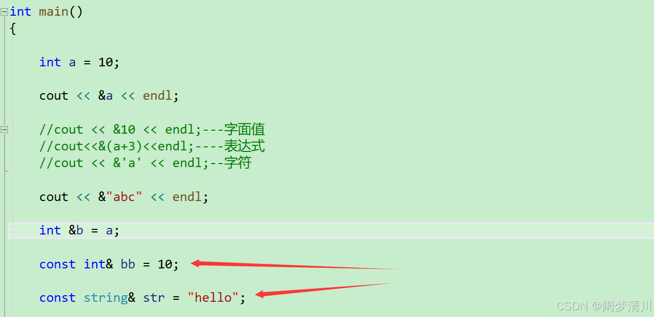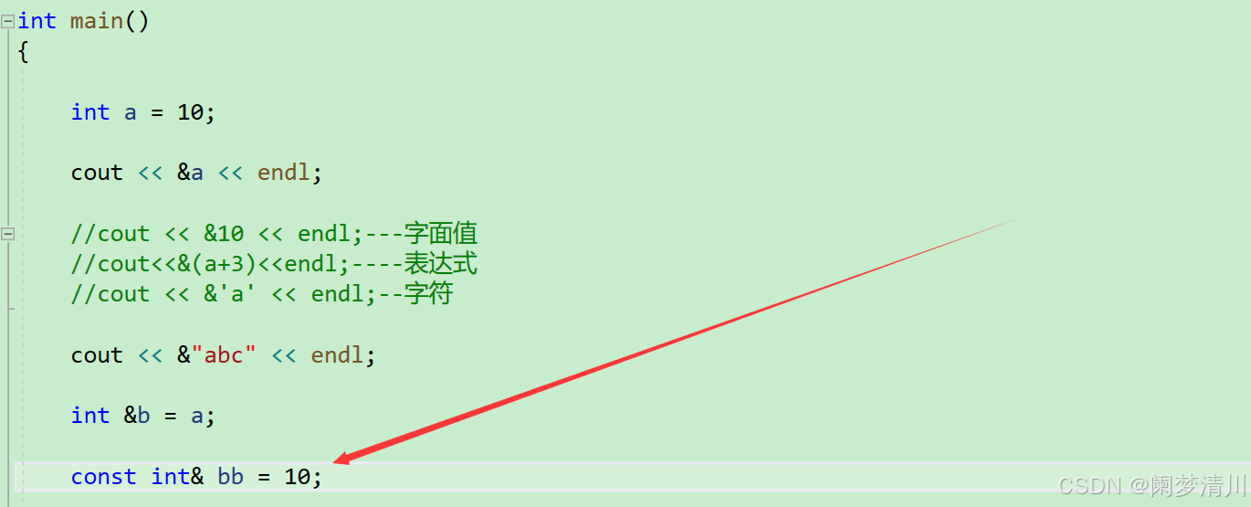 原来,我们直接在这个引用表达式的右边写上10,肯定是会报错的,因为这个10无法进行取地址的操作,也就是说这个10是右值,但是我们在这个前面加上这个const进行修饰之后,这个报错的信息就会消失;