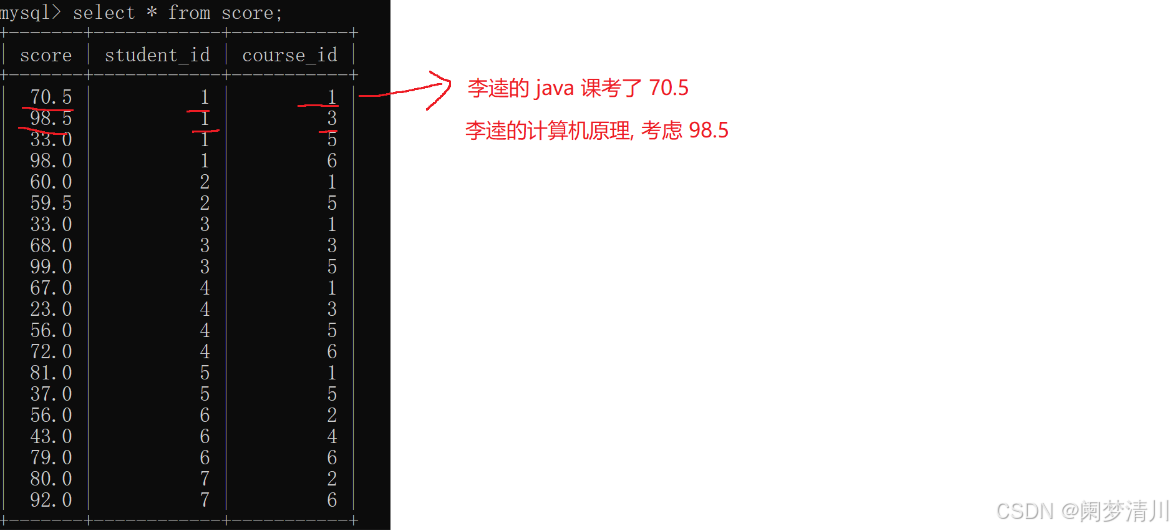 这个分数表里面虽然都是数字,但是这个是可以看出来一定的信息的,这个score就是我们的分数,但是这个student_id和course_id就需要到上面的表里面去找到对应的这个课程的名字和学生的名字,例如这个里面的第一行的student_id对象的就是李逵,course_id对应的就是课程表里面的这个java课程,因此这个就是李逵同学的这个java课程的分数就是70.5,通过这样的方式,我们在每一行数据代表的都是某一个同学的某一门课程的实际分数;