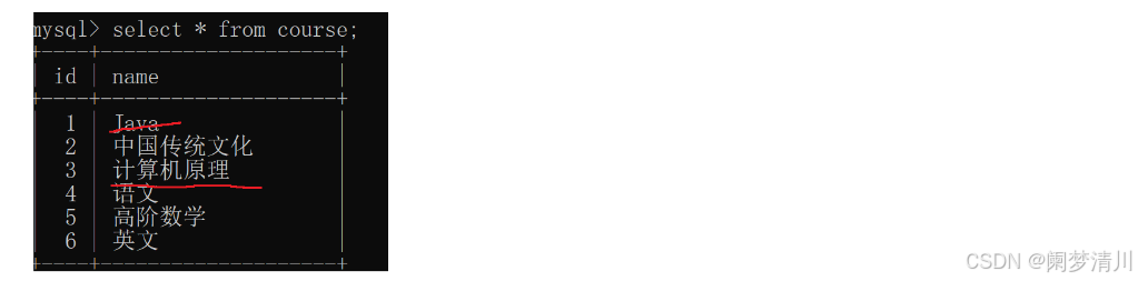 最后的结果和我们的课程表进行笛卡尔积就可以得到这个课程的名字;