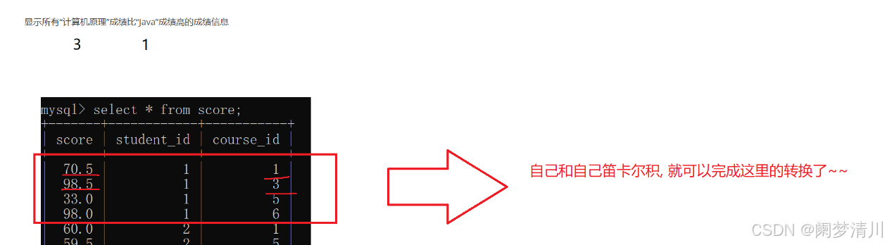 这个时候我们想要比较,需要是这个相同的student_id,找出这个对应的这个1,3(分别对应这个计算机原理和java课程)对应的成绩进行比较,这个就需要使用我们的自连接;