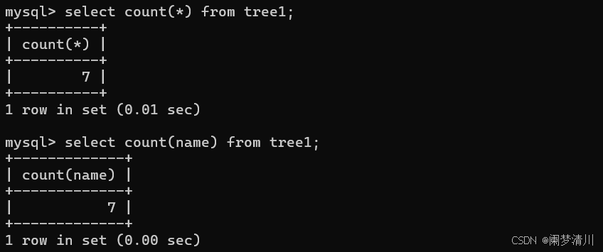 下面的这个就是聚合查询里面的这个count的使用,我们可以使用这个count计算这个数据的行数,虽然我们通过这个select好像是可以看到这个数据的行数的,但是这个是客户端,当我们在这个服务器里面通过代码来操作的时候,我们是看不到这个信息的,因此这个count还是很有必要的;