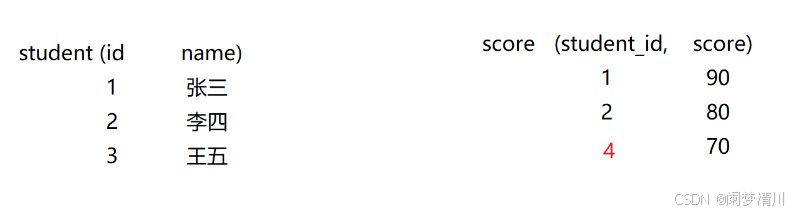 右外连接:select * from student right join score on student.id=score.id;