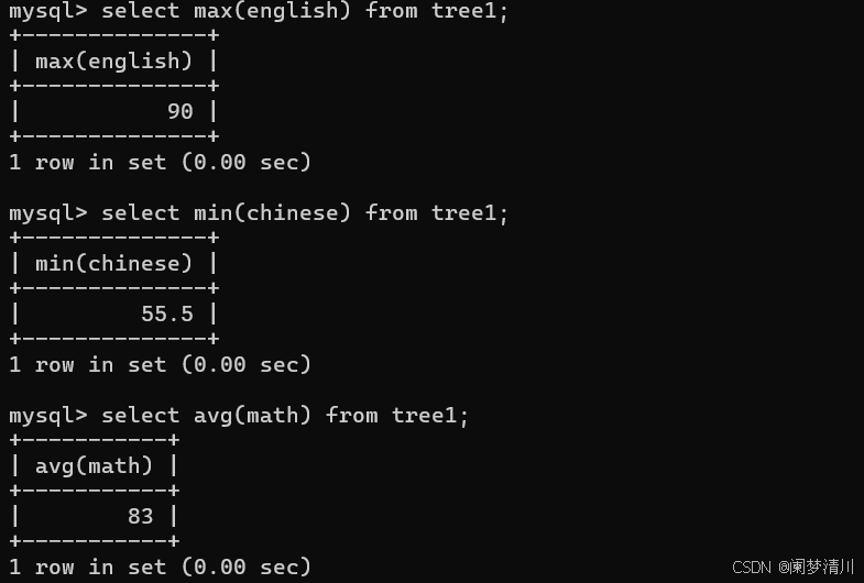 除此之外,这个SQL语句里面,还可以使用这个min,max,avg这样的函数,进行一些数据的处理:下面的这个就是求出来某一门科目的这个最大值,最小值,以及平均值的SQL语句,其实也不是很困难;
